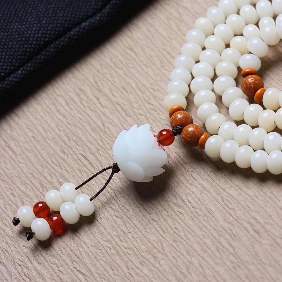 ✅ Materials: 108 hand-selected white jade bodhi beads with carved lotus pendant and olive pit spacers