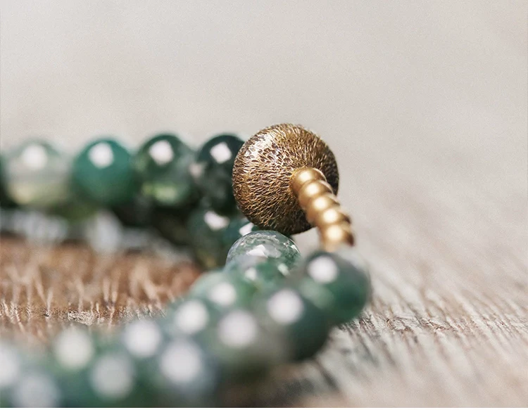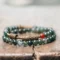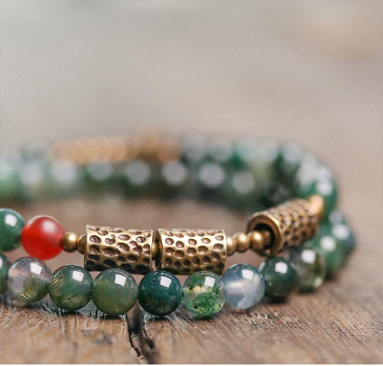 Embrace the calm of nature with this double-layered moss agate bracelet, adorned with vintage-style brass accents. Every bead holds the serene imagery of green moss frozen in time, evoking still forests and quiet strength.